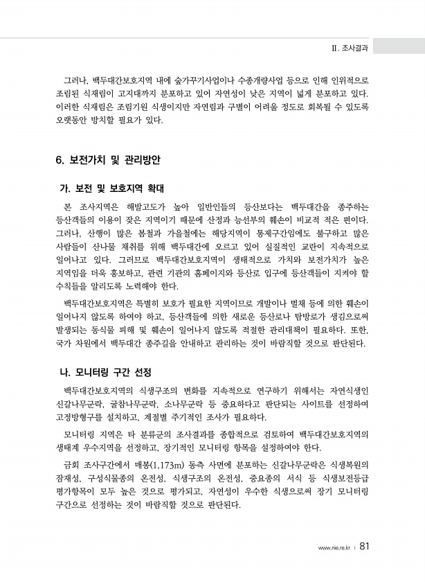 Ⅱ. 조사결과 www.nie.re.kr ? 81 그러나, 백두대간보호지역 내에 숲가꾸기사업이나 수종개량사업 등으로 인해 인위적으로 조림된 식재림이 고지대까지 분포하고 있어 자연성이 낮은 지역이 넓게 분포하고 있다. 이러한 식재림은 조림기원 식생이지만 자연림과 구별이 어려울 정도로 회복될 수 있도록 오랫동안 방치할 필요가 있다. 6. 보전가치 및 관리방안 가. 보전 및 보호지역 확대 본 조사지역은 해발고도가 높아 일반인들의 등산보다는 백두대간을 종주하는 등산객들의 이용이 잦은 지역이기 때문에 산정과 능선부의 훼손이 비교적 적은 편이다. 그러나, 산행이 많은 봄철과 가을철에는 해당지역이 통제구간임에도 불구하고 많은 사람들이 산나물 채취를 위해 백두대간에 오르고 있어 실질적인 교란이 지속적으로 일어나고 있다. 그...