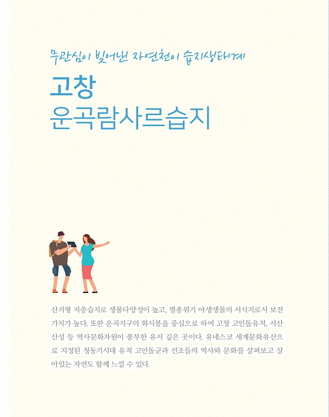 고창 운곡람사르습지 무관심이 빚어낸 자연천이 습지생태계 산지형 저층습지로 생물다양성이 높고, 멸종위기 야생생물의 서식지로서 보전 가치가 높다. 또한 운곡지구의 화시봉을 중심으로 하여 고창 고인돌유적, 서산 산성 등 역사문화자원이 풍부한 유서 깊은 곳이다. 유네스코 세계문화유산으 로 지정된 청동기시대 유적 고인돌군과 선조들의 역사와 문화를 살펴보고 살 아있는 자연도 함께 느낄 수있다.