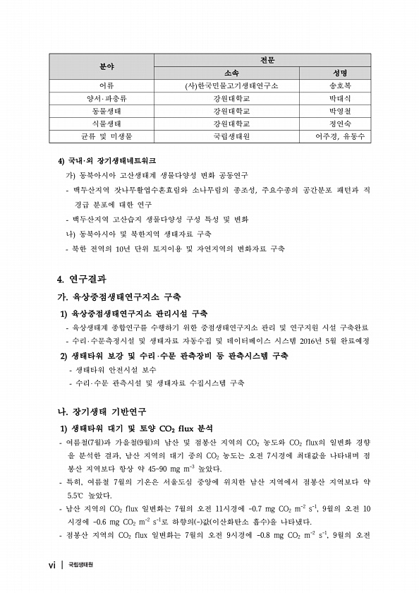 분야 전문 소속 성명 어류 사 한국민물고기생태연구소 송호복 양서 파충류 강원대학교 박대식 동물생태 강원대학교 박영철 식물생태 강원대학교 정연숙 균류 및 미생물 국립생태원 어주경 유동수 국내 외 장기생태네트워크 가 동북아시아 고산생태계 생물다양성 변화 공동연구 백두산지역 잣나무활엽수혼효림와 소나무림의 종조성 주요수종의 공간분포 패턴과 직 경급 분포에 대한 연구 백두산지역 고산습지 생물다양성 구성 특성 및 변화 나 동북아시아 및 북한지역 생태자료 구축 북한 전역의 년 단위 토지이용 및 자연지역의 변화자료 구축 연구결과 가 육상중점생태연구지소 구축 육상중점생태연구지소 관리시설 구축 육상생태계 종합연구를 수행하기 위한 중점생태연구지소 관리 및 연구지원 시설 구축완료 수리 수문측정시설 및 생태자료 자동수집 및 데이터...