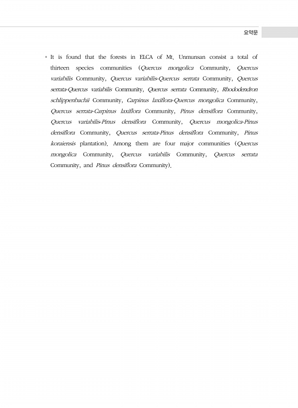 요약문 It is found that the forests in ELCA of Mt. Unmunsan consist a total of thirteen species communities Quercus mongolica Community, Quercus variabilis Community, Quercus variabilis-Quercus serrata Community, Quercus serrata-Quercus variabilis Community, Quercus serrata Community, Rhododendron schlippenbachii Community, Carpinus laxiflora-Quercus mongolica Community, Quercus serrata-Carpinus laxi...