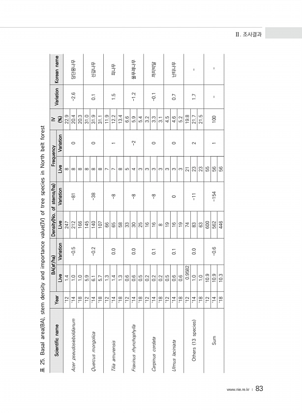 Scientific name Year BA ㎡/ha Density No. of stems/ha Frequency IV Variation Korean name Live Variation Live Variation Live Variation % Acer pseudosieboldianum ‘12 1.4 -0.5 247 -81 8 0 22.9 ‘14 1.0 212 8 20.4 -2.6 당단풍나무 ‘18 1.0 166 8 20.3 Quercus mongolica ‘12 5.9 -0.2 145 -38 8 0 31.0 ‘14 6.1 140 8 31.9 0.1 신갈나무 ‘18 5.7 107 8 31.1 Tilia amurensis ‘12 1.3 0.0 66 -8 7 1 11.9 ‘14 1.4 65 7 12.2 1.5 피나...