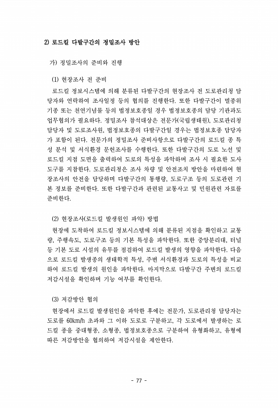 77 2 로드킬 다발구간의 정밀조사 방안 가 정밀조사의 준비와 진행 1 현장조사 전 준비 로드킬 정보시스템에 의해 분류된 다발구간의 현장조사 전 도로관리청 담 당자와 연락하여 조사일정 등의 협의를 진행한다. 또한 다발구간이 멸종위 기종 또는 천연기념물 등의 법정보호종일 경우 법정보호종의 담당 기관과도 업무협의가 필요하다. 정밀조사 참석대상은 전문가 국립생태원 , 도로관리청 담당자 및 도로조사원, 법정보호종의 다발구간일 경우는 법정보호종 담당자 가 포함이 된다. 전문가의 정밀조사 준비사항으로 다발구간의 로드킬 종 특 성 분석 및 서식환경 문헌조사를 수행한다. 또한 다발구간의 도로 노선 및 로드킬 지점 도면을 출력하여 도로의 특성을 파악하며 조사 시 필요한 도사 도구를 지참한다. 도로관리청은 조사 차량 및 안전...