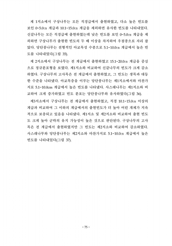 75 제 1지소에서 구상나무는 모든 직경급에서 출현하였고, 다소 높은 빈도를 보인 05.0㎝ 계급과 10.115.0㎝ 계급을 제외하면 유사한 빈도를 나타내었다. 신갈나무는 모든 직경급에 출현하였는데 낮은 빈도를 보인 05.0㎝ 계급을 제 외하면 구상나무가 출현한 빈도의 두 배 이상을 차지하여 우점종으로 자리 잡 았다. 당단풍나무는 전형적인 아교목성 수종으로 5.110.0㎝ 계급에서 높은 빈 도를 나타내었다 그림 35 제 2지소에서 구상나무는 전 계급에서 출현하였고 15.120.0㎝ 계급을 중심 으로 정규분포형을 보였다. 제1지소와 비교하여 신갈나무의 빈도가 크게 감소 하였다. 구상나무의 고사목은 전 계급에서 출현하였고, 그 빈도는 생목과 대등 한 수준을 나타냈다. 아교목층을 이루는 당단풍나무는 제1지소에서와...