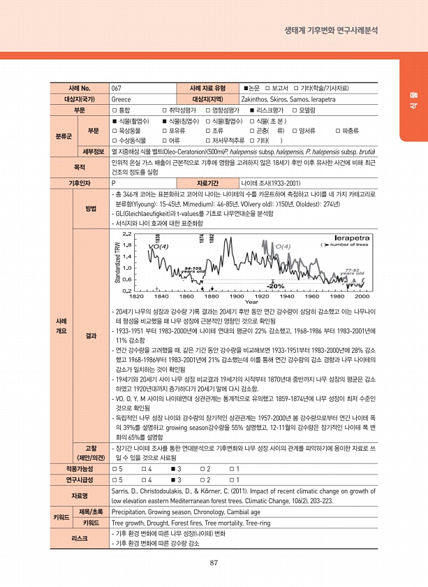 87 생태계 기후변화 연구사례분석 식 물 사례 No. 067 사례 자료 유형 ■논문 □ 보고서 □ 기타 학술/기사자료 대상지 국가 Greece 대상지 지역 Zakinthos, Skiros, Samos, Ierapetra 부문 □ 통합 □ 취약성평가 □ 영향성평가 ■ 리스크평가 □ 모델링 분류군 부문 ■ 식물 활엽수 ■ 식물 침엽수 □ 식물 활엽수 □ 식물 초 본 □ 육상동물 □ 포유류 □ 조류 □ 곤충 류 □ 양서류 □ 파충류 □ 수상동식물 □ 어류 □ 저서무척추류 □ 기타 세부정보 열 지중해성 식물 벨트 Oleo-Ceratonion 500m P. halepensis subsp. halepensis, P. halepensis subsp. brutia 목적 인위적 온실 가스 배출이 근본적으로 기후에 영향을 고...