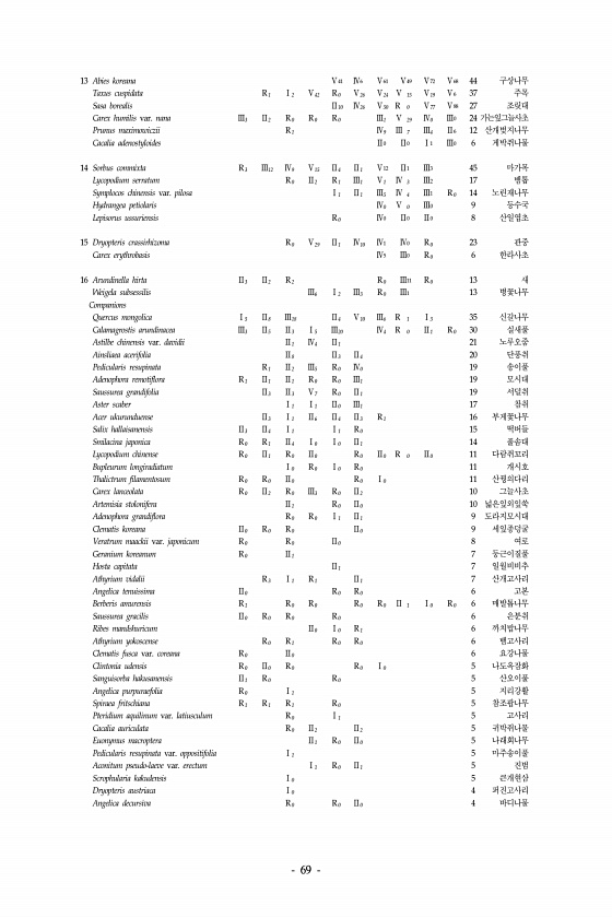 69 13 Abies koreana Ⅴ41 Ⅳ6 Ⅴ61 Ⅴ49 Ⅴ72 Ⅴ68 44 구상나무 Taxus cuspidata R 1 Ⅰ2 Ⅴ42 R 0 Ⅴ26 Ⅴ24 Ⅴ 15 Ⅴ19 Ⅴ6 37 주목 Sasa borealis Ⅱ10 Ⅳ26 Ⅴ50 R 0 Ⅴ77 Ⅴ88 27 조릿대 Carex humilis var. nana Ⅲ3 Ⅱ2 R 0 R 0 R 0 Ⅲ1 Ⅴ 29 Ⅳ0 Ⅲ0 24 가는잎그늘사초 Prunus maximowiczii R 1 Ⅳ9 Ⅲ 7 Ⅲ4 Ⅱ6 12 산개벚지나무 Cacalia adenostyloides Ⅱ0 Ⅱ0 Ⅰ1 Ⅲ0 6 게박쥐나물 14 Sorbus commixta R 3 Ⅲ12 Ⅳ9 Ⅴ15 Ⅱ4 Ⅱ1 Ⅴ12 Ⅱ1 Ⅲ3 45 마가목 Lycopodium serratum R 0 Ⅱ2 R 1 Ⅲ1...