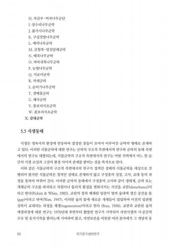 90 국가장기생태연구 H. 자금우-비자나무군단 I. 상수리나무군락 J. 붉가시나무군락 K. 구실잣밤나무군락 L. 예덕나무군락 M. 산철쭉-털진달래군락 N. 때죽나무군락 O. 까마귀쪽나무군락 P. 눈향나무군락 Q. 시로미군락 R. 억새군락 S. 순비기나무군락 T. 갯메꽃군락 U. 해국군락 V. 통보리사초군락 W. 좀보리사초군락 X. 갈대군락 5.5 식생동태 식생은 생육지의 환경에 반응하여 결정된 종들이 모여서 이루어진 군락의 형태로 존재하 고 있다. 이러한 식물군락에 대한 연구는 군락의 구조적 측면에서의 연구와 군락의 동태 측면 에서의 연구로 대별되는데, 식물군락의 구조적 측면에서의 연구는 어떤 지역에서 어느 한 순 간의 식생 조성과 그것의 환경 사이의 관계를 밝히는 것을 목적으로 한다. 이와 같은 식물군락의...