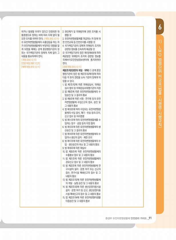6 환경부 유전자변형생물체 안전관리 가이드 _91 1 L M O 법령단위 비교표 법률- 시행령- 시행규칙 하거나 발생할 우려가 있다고 인정되면 대 통령령으로 정하는 바에 따라 지체 없이 필 요한 조치를 하여야 한다. 개정 2012.12.11 ② 유전자변형생물체의 수출입등을 하는 자 가 유전자변형생물체의 부정적인 영향을 알 게 되었을 때에는 관계 중앙행정기관의 장 또는 국가책임기관의 장에게 지체 없이 그 내용을 통보하여야 한다. 개정 2012.12.11 [전문개정 2007.12.21] [제목개정 2012.12.11] 2. 원인제거 및 피해방지에 관한 조치를 시 행할 것 3. 유전자변형생물체를 취급하는 자 등에 대 한 안전교육 등 안전조치를 시행할 것 4. 국가책임기관의 장에게 위해방지 조치와 관련된 정보를 신...