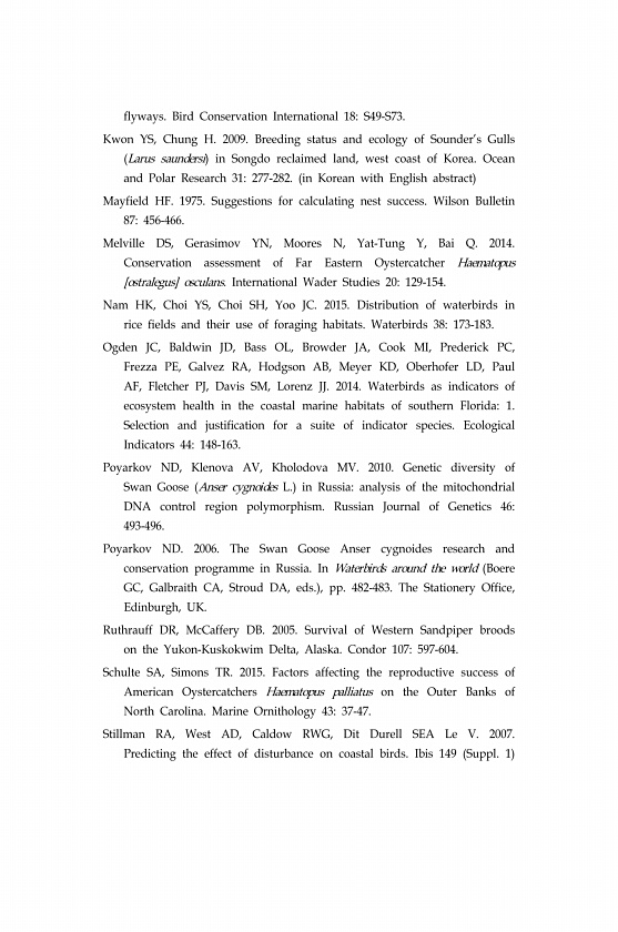 flyways. Bird Conservation International 18S49-S73. Kwon YS, Chung H. 2009. Breeding status and ecology of Sounders Gulls Larus saundersi in Songdo reclaimed land, west coast of Korea. Ocean and Polar Research 31277-282. in Korean with English abstract Mayfield HF. 1975. Suggestions for calculating nest success. Wilson Bulletin 87456-466. Melville DS, Gerasimov YN, Moores N, Yat-Tung Y, Bai Q. 201...