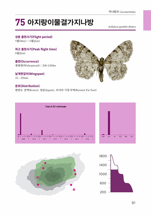91 자나방과 Geometridae 성충 출현시기 Flight period 5월 May 6월 Jun 최고 출현시기 Peak fight time 6월 Jun 출현 Occurrence 광범위 Widespread 200-1200m 날개편길이 Wingspan 22 29mm 분포 Distribution 한반도 전역 Korea , 일본 Japan , 러시아 극동지역 Russian Far East Aethalura ignobilis Butler M J J A S O M J J A S O M J J A S O M J J A S O M J J A S O M J J A S O M J J A S O May Jun Jul Aug Sep Oct 2009 2010 2011 2012 2013 2014 2015 Total of 221 ...
