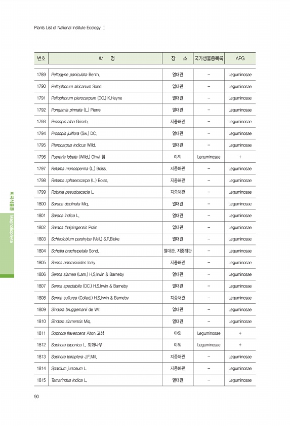 90 번호 학 명 장 소 국가생물종목록 APG 피자식물문 Magnoliophyta Plants List of National Institute Ecology Ⅰ 1789 Peltogyne paniculata Benth. 열대관 Leguminosae 1790 Peltophorum africanum Sond. 열대관 Leguminosae 1791 Peltophorum pterocarpum DC. K.Heyne 열대관 Leguminosae 1792 Pongamia pinnata L. Pierre 열대관 Leguminosae 1793 Prosopis alba Griseb. 지중해관 Leguminosae 1794 Prosopis juliflora Sw. DC. 열대관 Leguminosae 1795 Pterocarpu...