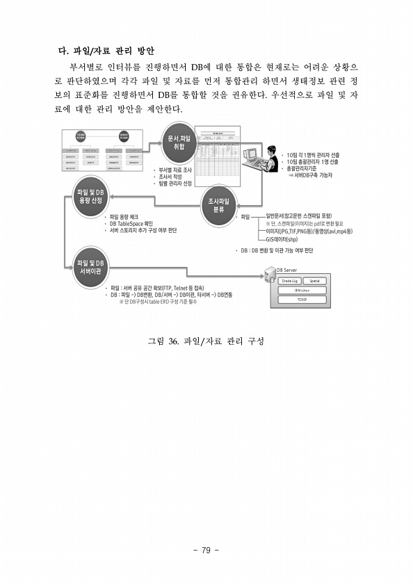 다. 파일/자료 관리 방안 부서별로 인터뷰를 진행하면서 DB에 대한 통합은 현재로는 어려운 상황으 로 판단하였으며 각각 파일 및 자료를 먼저 통합관리 하면서 생태정보 관련 정 보의 표준화를 진행하면서 DB를 통합할 것을 권유한다. 우선적으로 파일 및 자 료에 대한 관리 방안을 제안한다. 그림 36. 파일/자료 관리구성