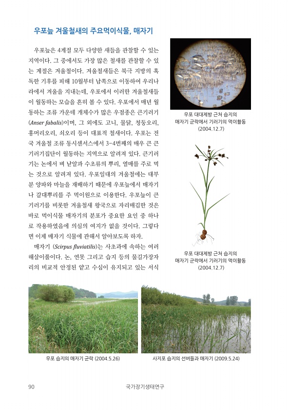 90 국가장기생태연구 우포늪 겨울철새의 주요먹이식물, 매자기 우포늪은 4계절 모두 다양한 새들을 관찰할 수 있는 지역이다. 그 중에서도 가장 많은 철새를 관찰할 수 있 는 계절은 겨울철이다. 겨울철새들은 북극 지방의 혹 독한 기후를 피해 10월부터 남쪽으로 이동하여 우리나 라에서 겨울을 지내는데, 우포에서 이러한 겨울철새들 이 월동하는 모습을 흔히 볼 수 있다. 우포에서 매년 월 동하는 조류 가운데 개체수가 많은 우점종은 큰기러기 Anser fabalis 이며, 그 외에도 고니, 물닭, 청둥오리, 홍머리오리, 쇠오리 등이 대표적 철새이다. 우포는 전 국 겨울철 조류 동시센서스에서 3-4번째의 매우 큰 큰 기러기집단이 월동하는 지역으로 알려져 있다. 큰기러 기는 논에서 벼 낟알과 수초류의 뿌리, 열매를 주로 ...