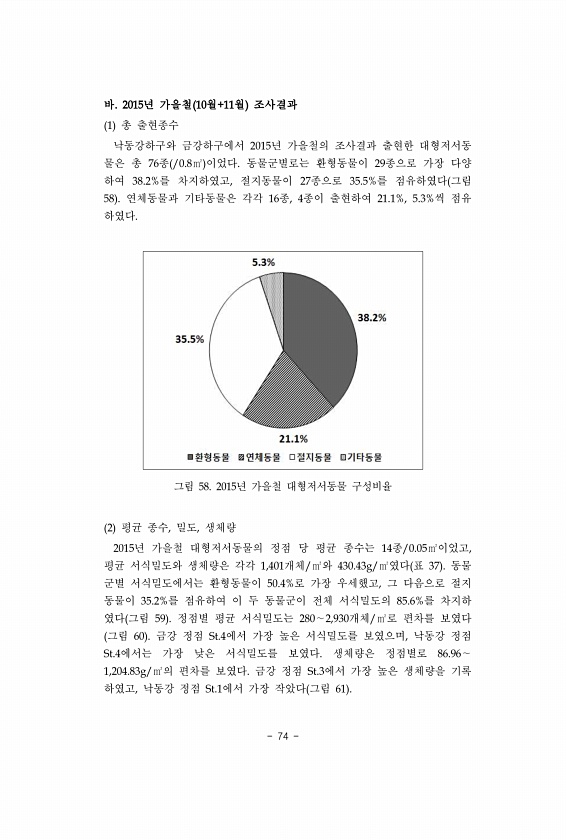 74 바. 2015년 가을철 10월+11월 조사결과 1 총 출현종수 낙동강하구와 금강하구에서 2015년 가을철의 조사결과 출현한 대형저서동 물은 총 76종 /0.8㎡ 이었다. 동물군별로는 환형동물이 29종으로 가장 다양 하여 38.2%를 차지하였고, 절지동물이 27종으로 35.5%를 점유하였다 그림 58 연체동물과 기타동물은 각각 16종, 4종이 출현하여 21.1%, 5.3%씩 점유 하였다. 그림 58. 2015년 가을철 대형저서동물 구성비율 2 평균 종수, 밀도, 생체량 2015년 가을철 대형저서동물의 정점 당 평균 종수는 14종/0.05㎡이었고, 평균 서식밀도와 생체량은 각각 1,401개체/㎡와 430.43g/㎡였다 표 37 동물 군별 서식밀도에서는 환형동물이 50.4%로 가장 우세했고, 그 다음으로 절...