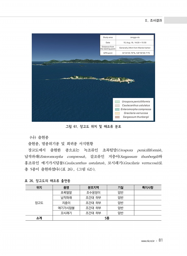 Ⅱ. 조사결과 www.nie.re.kr ? 81 그림 61. 장고도 위치 및 해조류 분포 나 출현종 출현종, 멸종위기종 및 희귀종 서식현황 장고도에서 출현한 종으로는 녹조류인 초록털말 Urospora penicilliformis , 납작파래 Enteromorpha compressa , 갈조류인 지충이 Sargassum thunbergii 와 홍조류인 애기가시덤불 Caulacanthus ustulatus , 꼬시래기 Gracilaria verrucosa 로 총 5종이 출현하였다 표 26 , 그림 62 표 26. 장고도의 해조류 출현종 위치 품명 분포지역 기질 특이사항 장고도 초록털말 조수웅덩이 암반 납작파래 조간대 하부 암반 지충이 조간대 하부 암반 애기가시덤불 조간대 하부 암반 꼬시래기 조간대 하부 암반 소...