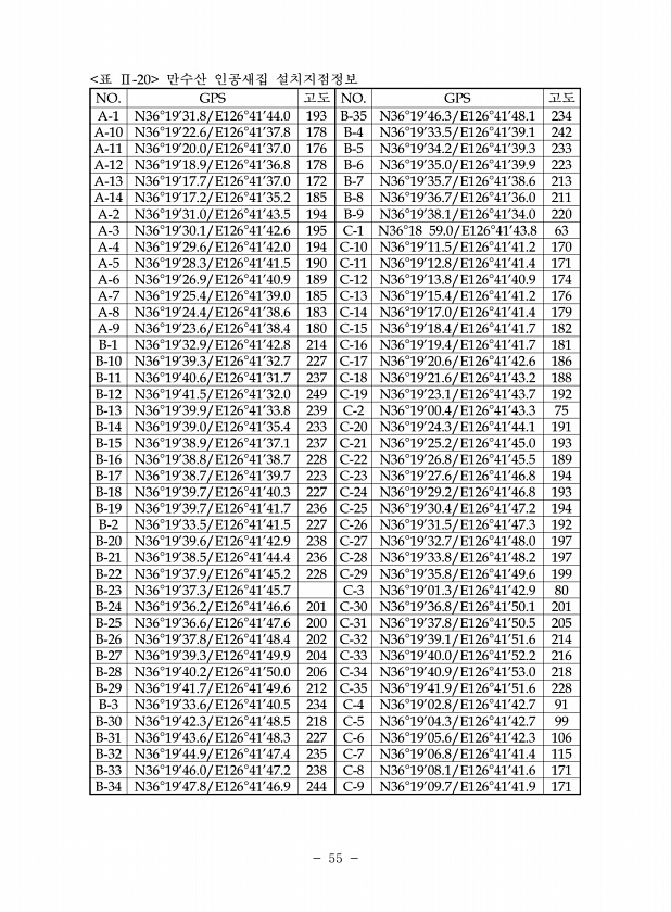 55 표 Ⅱ-20 만수산 인공새집 설치지점정보 NO. GPS 고도 NO. GPS 고도 A-1 N36°1931.8/E126°4144.0 193 B-35 N36°1946.3/E126°4148.1 234 A-10 N36°1922.6/E126°4137.8 178 B-4 N36°1933.5/E126°4139.1 242 A-11 N36°1920.0/E126°4137.0 176 B-5 N36°1934.2/E126°4139.3 233 A-12 N36°1918.9/E126°4136.8 178 B-6 N36°1935.0/E126°4139.9 223 A-13 N36°1917.7/E126°4137.0 172 B-7 N36°1935.7/E126°4138.6 213 A-14 N36°1917.2/E126°4135.2 185 B-8 N...