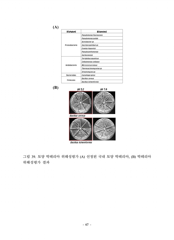 67 그림 39. 토양 박테리아 위해성평가 A 선정된 국내 토양 박테리아, B 박테리아 위해성평가결과