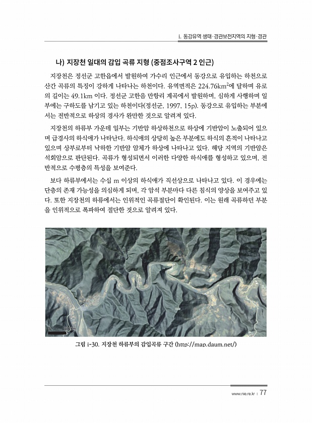 i. 동강유역 생태·경관보전지역의 지형·경관 www.nie.re.kr ? 77 2 지장천은 정선군 고한읍에서 발원하여 가수리 인근에서 동강으로 유입하는 하천으로 산간 곡류의 특징이 강하게 나타나는 하천이다. 유역면적은 224.76km2에 달하며 유로 의 길이는 49.1km 이다. 정선군 고한음 만항리 계곡에서 발원하며, 심하게 사행하며 일 부에는 구하도를 남기고 있는 하천이다 정선군, 1997, 15p 동강으로 유입하는 부분에 서는 전반적으로 하상의 경사가 완만한 것으로 알려져 있다. 지장천의 하류부 가운데 일부는 기반암 하상하천으로 하상에 기반암이 노출되어 있으 며 급경사의 하식애가 나타난다. 하식애의 상당히 높은 부분에도 하식의 흔적이 나타나고 있으며 상부로부터 낙하한 기반암 암체가 하상에 나타나고 있다...