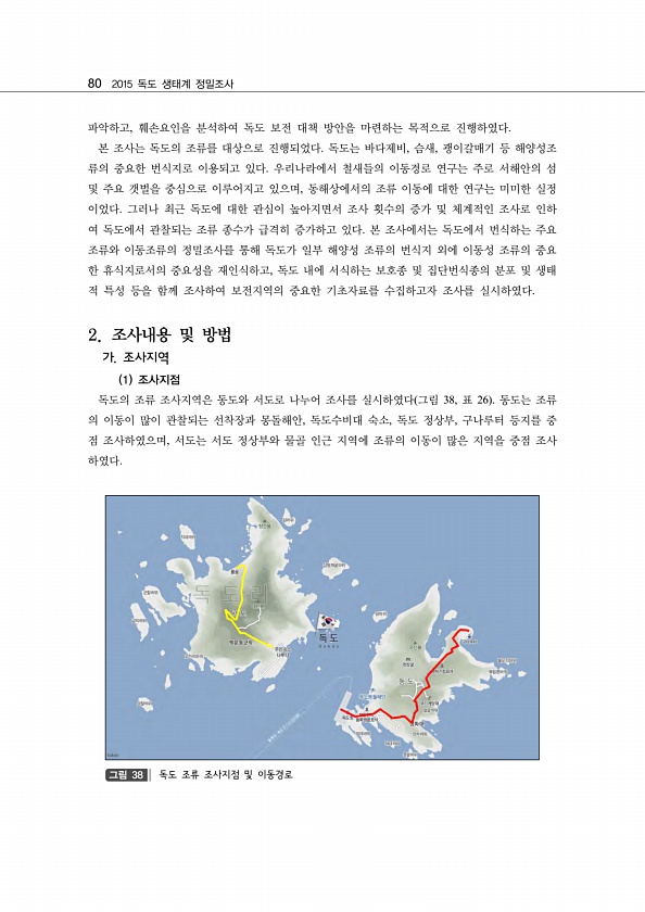 80 2015 독도 생태계 정밀조사 파악하고, 훼손요인을 분석하여 독도 보전 대책 방안을 마련하는 목적으로 진행하였다. 본 조사는 독도의 조류를 대상으로 진행되었다. 독도는 바다제비, 슴새, 괭이갈매기 등 해양성조 류의 중요한 번식지로 이용되고 있다. 우리나라에서 철새들의 이동경로 연구는 주로 서해안의 섬 및 주요 갯벌을 중심으로 이루어지고 있으며, 동해상에서의 조류 이동에 대한 연구는 미미한 실정 이었다. 그러나 최근 독도에 대한 관심이 높아지면서 조사 횟수의 증가 및 체계적인 조사로 인하 여 독도에서 관찰되는 조류 종수가 급격히 증가하고 있다. 본 조사에서는 독도에서 번식하는 주요 조류와 이동조류의 정밀조사를 통해 독도가 일부 해양성 조류의 번식지 외에 이동성 조류의 중요 한 휴식지로서의 중요성을 재인식...