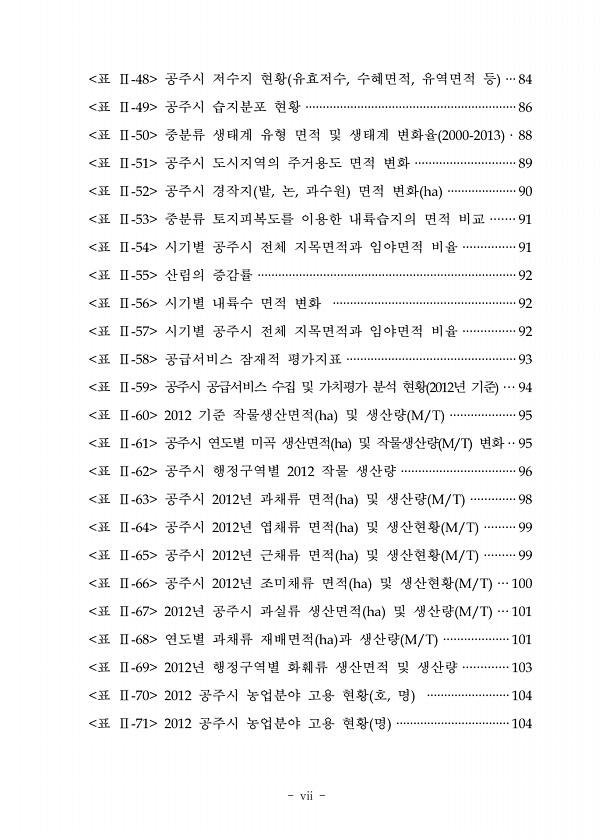 vii 표 공주시 저수지 현황 유효저수 수혜면적 유역면적 등 표 공주시 습지분포 현황 표 중분류 생태계 유형 면적 및 생태계 변화율 표 공주시 도시지역의 주거용도 면적 변화 표 공주시 경작지 밭 논 과수원 면적 변화 표 중분류 토지피복도를 이용한 내륙습지의 면적 비교 표 시기별 공주시 전체 지목면적과 임야면적 비율 표 산림의 증감률 표 시기별 내륙수 면적 변화 표 시기별 공주시 전체 지목면적과 임야면적 비율 표 공급서비스 잠재적 평가지표 표 공주시 공급서비스 수집 및 가치평가 분석 현황 년 기준 표 기준 작물생산면적 및 생산량 표 공주시 연도별 미곡 생산면적 및 작물생산량 변화 표 공주시 행정구역별 작물 생산량 표 공주시 년 과채류 면적 및 생산량 표 공주시 년 엽채류 면적 및 생산현황 표 공주시 년 근채류...