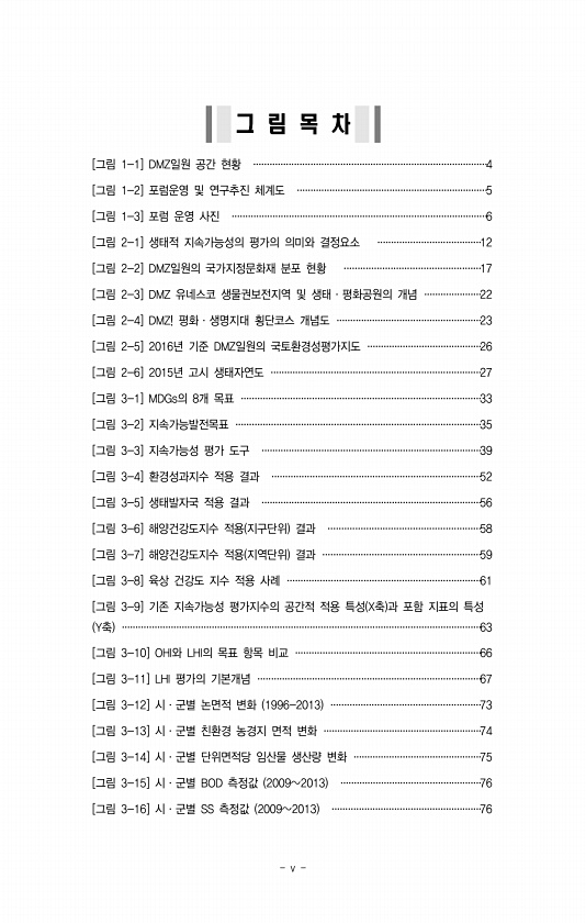 v 그 림 목 차 [그림 1-1] DMZ일원 공간 현황 ······················································································4 [그림 1-2] 포럼운영 및 연구추진 체계도 ······································································5 [그림 1-3] 포럼 운영 사진 ······························································································6 [그림 2-1] 생태적 지속가능성의 평가의 의미와 결정요소 ·····································...