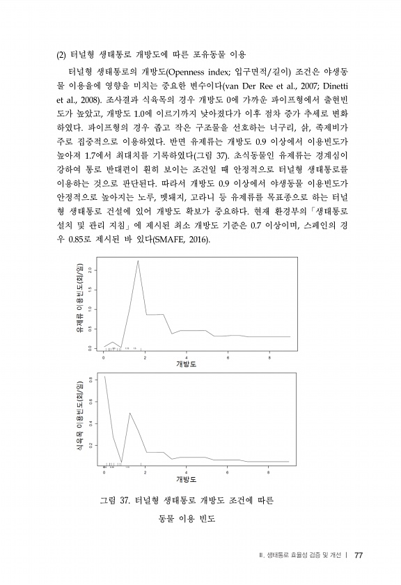 77 터널형 생태통로 개방도에 따른 포유동물 이용 터널형 생태통로의 개방도 입구면적 길이 조건은 야생동 물 이용율에 영향을 미치는 중요한 변수이다 조사결과 식육목의 경우 개방도 에 가까운 파이프형에서 출현빈 도가 높았고 개방도 에 이르기까지 낮아졌다가 이후 점차 증가 추세로 변화 하였다 파이프형의 경우 좁고 작은 구조물을 선호하는 너구리 삵 족제비가 주로 집중적으로 이용하였다 반면 유제류는 개방도 이상에서 이용빈도가 높아져 에서 최대치를 기록하였다 그림 초식동물인 유제류는 경계심이 강하여 통로 반대편이 훤히 보이는 조건일 때 안정적으로 터널형 생태통로를 이용하는 것으로 판단된다 따라서 개방도 이상에서 야생동물 이용빈도가 안정적으로 높아지는 노루 멧돼지 고라니 등 유제류를 목표종으로 하는 터널 형 생태통로 건...