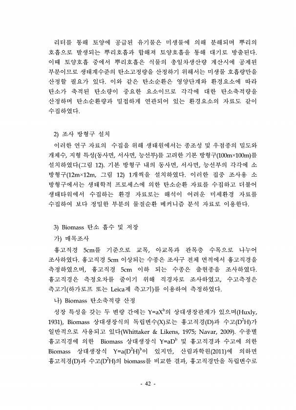 42 리터를 통해 토양에 공급된 유기물은 미생물에 의해 분해되며 뿌리의 호흡으로 발생되는 뿌리호흡과 합해져 토양호흡을 통해 대기로 방출된다. 이때 토양호흡 중에서 뿌리호흡은 식물의 총일차생산량 계산시에 공제된 부분이므로 생태계수준의 탄소고정량을 산정하기 위해서는 미생물 호흡량만을 산정할 필요가 있다. 이와 같은 탄소순환은 영양단계와 환경요소에 따라 탄소가 축적된 탄소량이 중요한 요소이므로 각각에 대한 탄소축적량을 산정하며 탄소순환량과 밀접하게 연관되어 있는 환경요소의 자료도 같이 수집하였다. 2 조사 방형구 설치 이러한 연구 자료의 수집을 위해 생태원에서는 종조성 및 우점종의 밀도와 개체수, 지형 특성 동사면, 서사면, 능선부 를 고려한 기본 방형구 100m×100m 를 설치하였다 그림 12 기본 방형구 내...