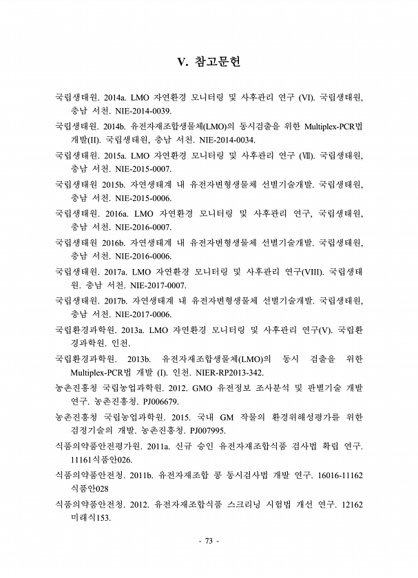 73 V. 참고문헌 국립생태원. 2014a. LMO 자연환경 모니터링 및 사후관리 연구 VI 국립생태원, 충남 서천. NIE-2014-0039. 국립생태원. 2014b. 유전자재조합생물체 LMO 의 동시검출을 위한 Multiplex-PCR법 개발 II 국립생태원, 충남 서천. NIE-2014-0034. 국립생태원. 2015a. LMO 자연환경 모니터링 및 사후관리 연구 Ⅶ 국립생태원, 충남 서천. NIE-2015-0007. 국립생태원 2015b. 자연생태계 내 유전자변형생물체 선별기술개발. 국립생태원, 충남 서천. NIE-2015-0006. 국립생태원. 2016a. LMO 자연환경 모니터링 및 사후관리 연구, 국립생태원, 충남 서천. NIE-2016-0007. 국립생태원 2016b. 자연생태계 내 유전자변형...