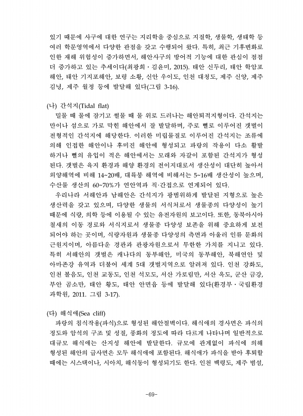 -69- 있기 때문에 사구에 대한 연구는 지리학을 중심으로 지질학 생물학 생태학 등 여러 학문영역에서 다양한 관점을 갖고 수행되어 왔다 특히 최근 기후변화로 인한 재해 위험성이 증가하면서 해안사구의 방어적 기능에 대한 관심이 점점 더 증가하고 있는 추세이다 최광희 김윤미 태안 신두리 태안 학암포 해안 태안 기지포해안 보령 소황 신안 우이도 인천 대청도 제주 신양 제주 김녕 제주 월정 등에 발달해 있다 그림 나 간석지 밀물 때 물에 잠기고 썰물 때 물 위로 드러나는 해안퇴적지형이다 간석지는 만이나 섬으로 가로 막힌 해안에서 잘 발달하며 주로 뻘로 이루어진 갯벌이 전형적인 간석지에 해당한다 이러한 미립물질로 이루어진 간석지는 조류에 의해 인접한 해안이나 후미진 해안에 형성되고 파랑의 작용이 다소 활발 하거나 뻘...