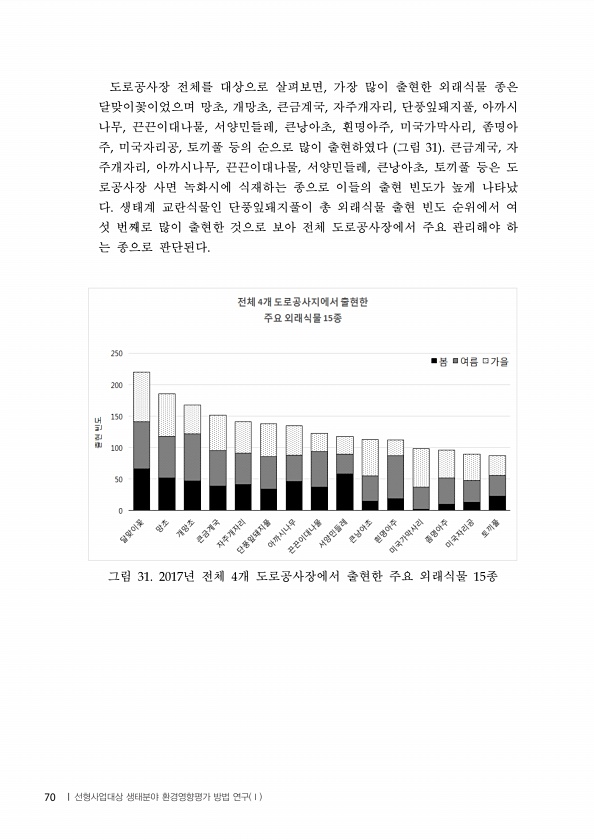 도로공사장 전체를 대상으로 살펴보면 가장 많이 출현한 외래식물 종은 달맞이꽃이었으며 망초 개망초 큰금계국 자주개자리 단풍잎돼지풀 아까시 나무 끈끈이대나물 서양민들레 큰낭아초 흰명아주 미국가막사리 좀명아 주 미국자리공 토끼풀 등의 순으로 많이 출현하였다 그림 큰금계국 자 주개자리 아까시나무 끈끈이대나물 서양민들레 큰낭아초 토끼풀 등은 도 로공사장 사면 녹화시에 식재하는 종으로 이들의 출현 빈도가 높게 나타났 다 생태계 교란식물인 단풍잎돼지풀이 총 외래식물 출현 빈도 순위에서 여 섯 번째로 많이 출현한 것으로 보아 전체 도로공사장에서 주요 관리해야 하 는 종으로 판단된다 그림 년 전체 개 도로공사장에서 출현한 주요 외래식물 종 70 | 선형사업대상 생태분야 환경영향평가 방법 연구 Ⅰ