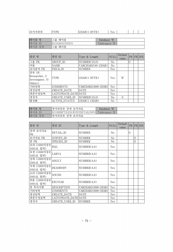 75 조사자종류 TYPE CHAR 1 BYTE Yes 테이블 명 그룹 테이블 Database 명 테이블 ID ECOGROUPINFO Tablespace 명 테이블 설명 그룹 테이블 컬럼 명 컬럼 ID Type & Length NULL Default value PK FK IDX 그룹 PK GROUP_ID NUMBER 10,0 No O 이름 NAME VARCHAR2 80 CHAR No 조사분야 PK FIELD_ID NUMBER Yes 종류 RResearcher, IInvestigator, OOthers TYPE CHAR 1 BYTE Yes R기타설명 COMMENTS VARCHAR2 2000 CHAR Yes 생성날짜 CREATE_DATE DATE Yes 최종수정날짜 LASTUPDATE_DATE DATE Yes 생...