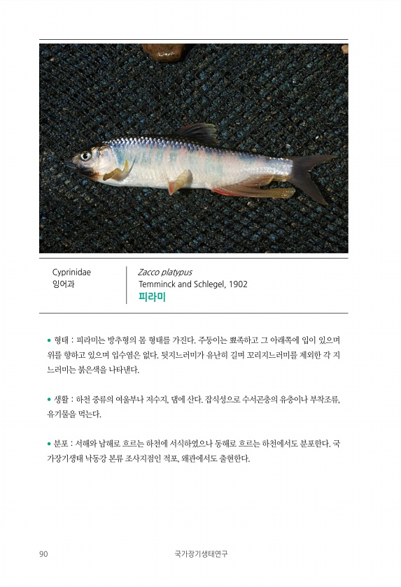 90 국가장기생태연구 ? 형태 피라미는 방추형의 몸 형태를 가진다. 주둥이는 뾰족하고 그 아래쪽에 입이 있으며 위를 향하고 있으며 입수염은 없다. 뒷지느러미가 유난히 길며 꼬리지느러미를 제외한 각 지 느러미는 붉은색을 나타낸다. ? 생활 하천 중류의 여울부나 저수지, 댐에 산다. 잡식성으로 수서곤충의 유충이나 부착조류, 유기물을 먹는다. ? 분포 서해와 남해로 흐르는 하천에 서식하였으나 동해로 흐르는 하천에서도 분포한다. 국 가장기생태 낙동강 본류 조사지점인 적포, 왜관에서도 출현한다. Cyprinidae 잉어과 Zacco platypus Temminck and Schlegel, 1902피라미