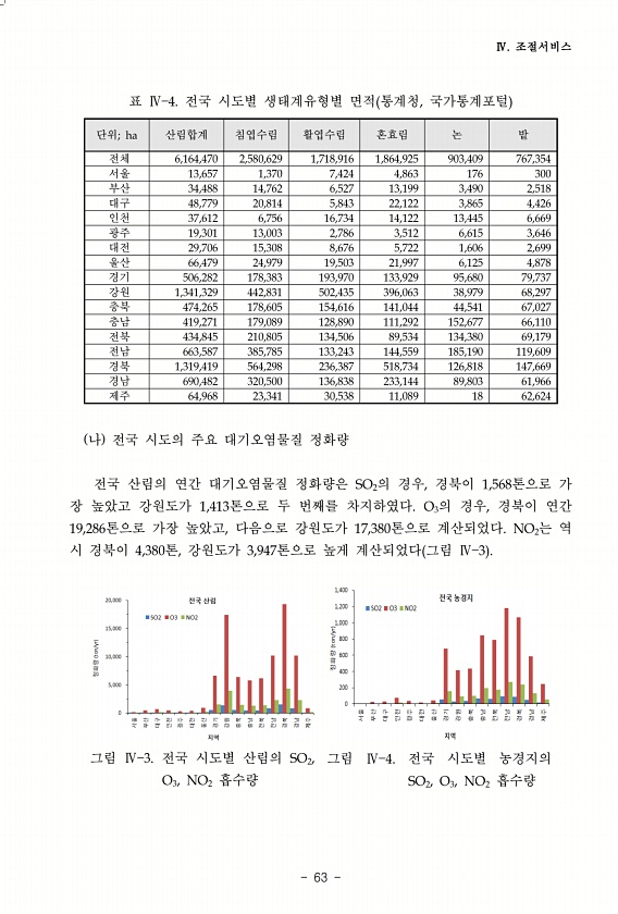 Ⅳ. 조절서비스 63 단위; ha 산림합계 침엽수림 활엽수림 혼효림 논 밭 전체 6,164,470 2,580,629 1,718,916 1,864,925 903,409 767,354 서울 13,657 1,370 7,424 4,863 176 300 부산 34,488 14,762 6,527 13,199 3,490 2,518 대구 48,779 20,814 5,843 22,122 3,865 4,426 인천 37,612 6,756 16,734 14,122 13,445 6,669 광주 19,301 13,003 2,786 3,512 6,615 3,646 대전 29,706 15,308 8,676 5,722 1,606 2,699 울산 66,479 24,979 19,503 21,997 6,125 4,878 경기 506,282 ...