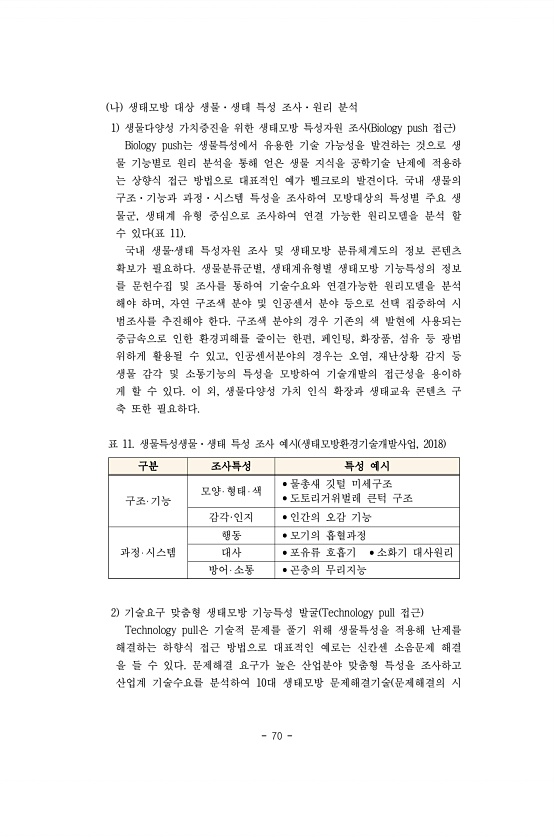 70 나 생태모방 대상 생물·생태 특성 조사·원리 분석 1 생물다양성 가치증진을 위한 생태모방 특성자원 조사 Biology push 접근 Biology push는 생물특성에서 유용한 기술 가능성을 발견하는 것으로 생 물 기능별로 원리 분석을 통해 얻은 생물 지식을 공학기술 난제에 적용하 는 상향식 접근 방법으로 대표적인 예가 벨크로의 발견이다. 국내 생물의 구조·기능과 과정·시스템 특성을 조사하여 모방대상의 특성별 주요 생 물군, 생태계 유형 중심으로 조사하여 연결 가능한 원리모델을 분석 할 수 있다 표 11 국내 생물?생태 특성자원 조사 및 생태모방 분류체계도의 정보 콘텐츠 확보가 필요하다. 생물분류군별, 생태계유형별 생태모방 기능특성의 정보 를 문헌수집 및 조사를 통하여 기술수요와 연결가능한 원리모델을 ...