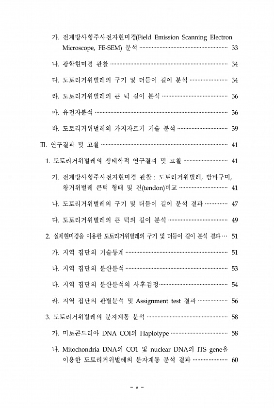 v 가. 전계방사형주사전자현미경 Field Emission Scanning Electron Microscope, FE-SEM 분석 ························································· 33 나. 광학현미경 관찰 ············································································ 34 다. 도토리거위벌레의 구기 및 더듬이 길이 분석 ························ 34 라. 도토리거위벌레의 큰 턱 길이 분석 ·········································· 36 마. 유전자분석 ··········································...