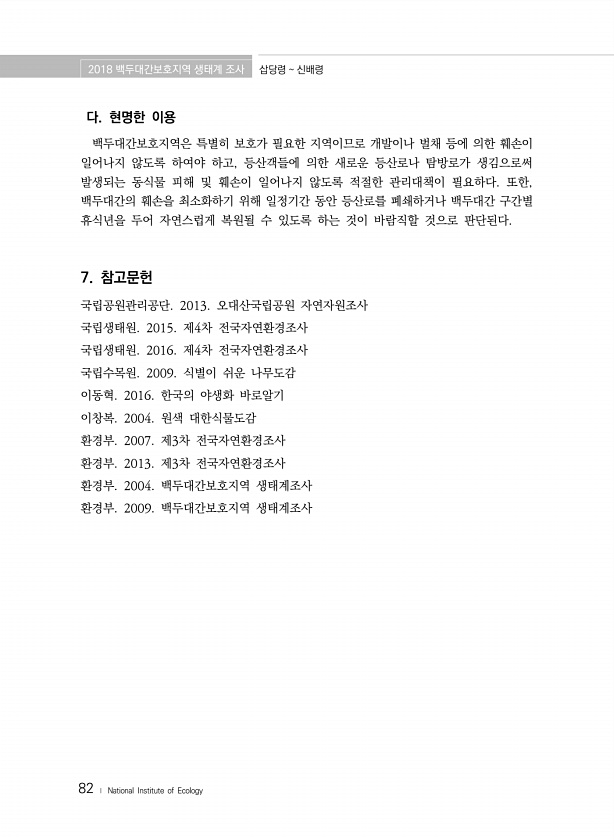 2018 백두대간보호지역 생태계 조사 삽당령 신배령 82 ? National Institute of Ecology 다. 현명한 이용 백두대간보호지역은 특별히 보호가 필요한 지역이므로 개발이나 벌채 등에 의한 훼손이 일어나지 않도록 하여야 하고, 등산객들에 의한 새로운 등산로나 탐방로가 생김으로써 발생되는 동식물 피해 및 훼손이 일어나지 않도록 적절한 관리대책이 필요하다. 또한, 백두대간의 훼손을 최소화하기 위해 일정기간 동안 등산로를 폐쇄하거나 백두대간 구간별 휴식년을 두어 자연스럽게 복원될 수 있도록 하는 것이 바람직할 것으로 판단된다. 7. 참고문헌 국립공원관리공단. 2013. 오대산국립공원 자연자원조사 국립생태원. 2015. 제4차 전국자연환경조사 국립생태원. 2016. 제4차 전국자연환경조사 국립수목...