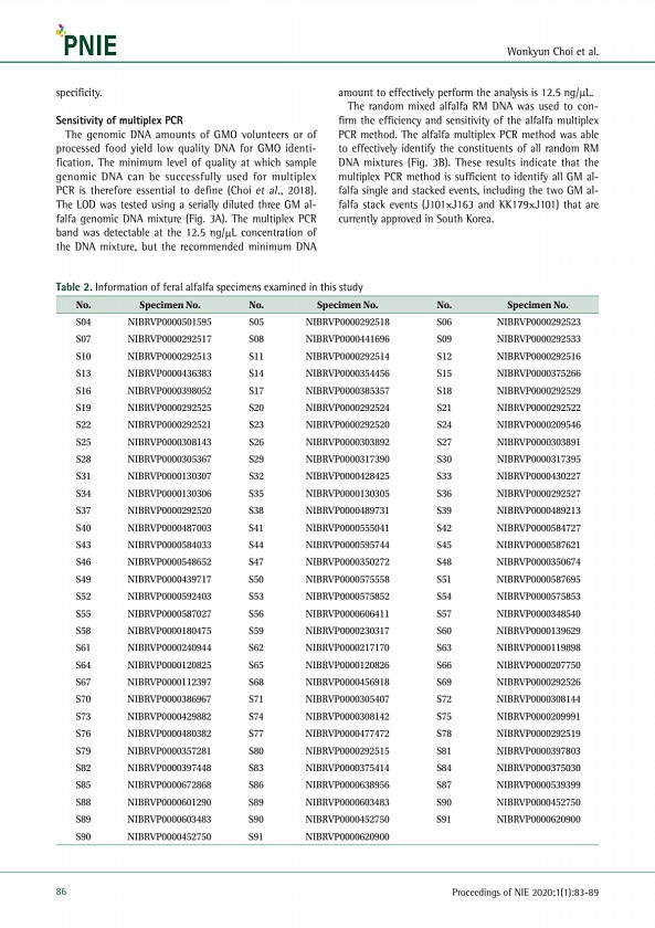Wonkyun Choi et al. 86 Proceedings of NIE 2020;1 1 83-89 specificity. Sensitivity of multiplex PCR The genomic DNA amounts of GMO volunteers or of processed food yield low quality DNA for GMO identification. The minimum level of quality at which sample genomic DNA can be successfully used for multiplex PCR is therefore essential to define Choi et al., 2018 The LOD was tested using a serially dilut...