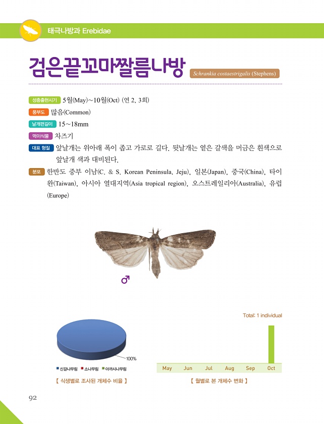 92 태극나방과 Erebidae 성충출현시기 5월 May 10월 Oct 연 2, 3회 풍부도 많음 Common 날개편길이 1518mm 먹이식물 차즈기 대표 형질 앞날개는 위아래 폭이 좁고 가로로 길다. 뒷날개는 옅은 갈색을 머금은 흰색으로 앞날개 색과 대비된다. 분포 한반도 중부 이남 C. & S. Korean Peninsula, Jeju , 일본 Japan , 중국 China , 타이 완 Taiwan , 아시아 열대지역 Asia tropical region , 오스트레일리아 Australia , 유럽 Europe 검은끝꼬마짤름나방 Schrankia costaestrigalis Stephens 【 식생별로 조사된 개체수 비율 】 100% 신갈나무림 소나무림 아까시나무림 【 월별로 본 개체수 변화 】 Tota...