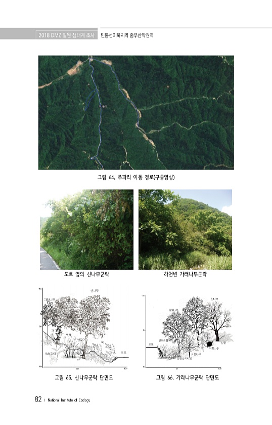 2018 DMZ 일원 생태계 조사 민통선이북지역 중부산악권역 82 ? National Institute of Ecology 그림 64. 주파리 이동 경로 구글영상 도로 옆의 신나무군락 하천변 가래나무군락 그림 65. 신나무군락 단면도 그림 66. 가래나무군락단면도