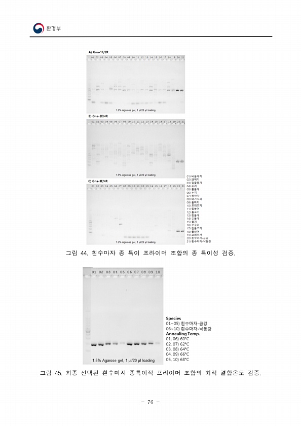 76 그림 44. 흰수마자 종 특이 프라이머 조합의 종 특이성 검증. 그림 45. 최종 선택된 흰수마자 종특이적 프라이머 조합의 최적 결합온도검증.