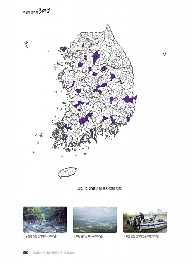 ? 울진 왕피천 생태계조사 2002년 ? 포천 운악산 북서쪽 2002년 ? 서울 밤섬 생태계합동조사 2004년 그림 12. 2005년의 조사지역 지도 092 NATIONAL INSTITUTE OF ECOLOGY자연환경조사30년