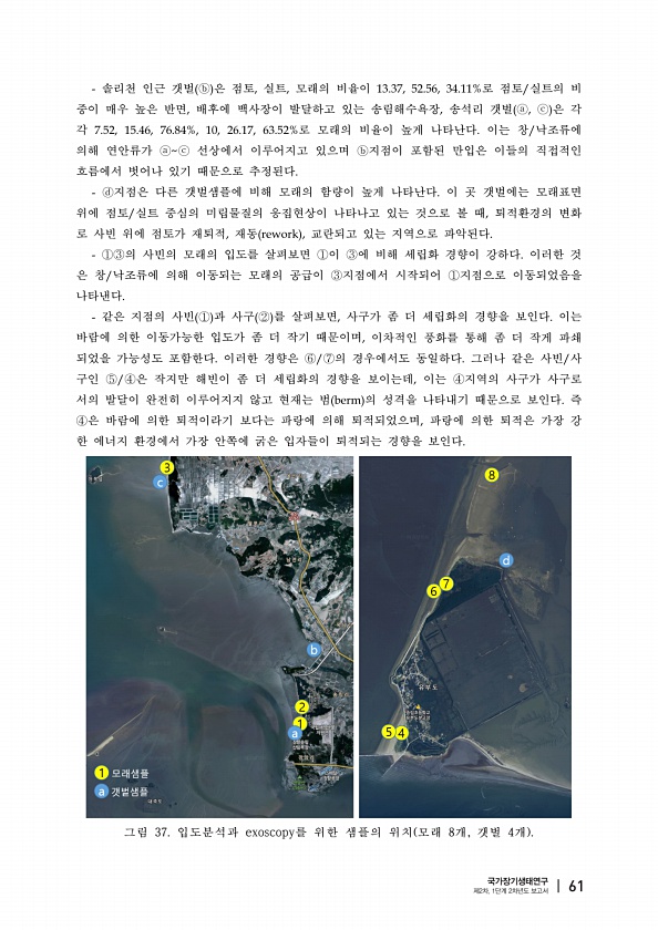 솔리천 인근 갯벌 은 점토 실트 모래의 비율이 로 점토 실트의 비 중이 매우 높은 반면 배후에 백사장이 발달하고 있는 송림해수욕장 송석리 갯벌 은 각 각 로 모래의 비율이 높게 나타난다 이는 창 낙조류에 의해 연안류가 선상에서 이루어지고 있으며 지점이 포함된 만입은 이들의 직접적인 흐름에서 벗어나 있기 때문으로 추정된다 지점은 다른 갯벌샘플에 비해 모래의 함량이 높게 나타난다 이 곳 갯벌에는 모래표면 위에 점토 실트 중심의 미립물질의 응집현상이 나타나고 있는 것으로 볼 때 퇴적환경의 변화 로 사빈 위에 점토가 재퇴적 재동 교란되고 있는 지역으로 파악된다 의 사빈의 모래의 입도를 살펴보면 이 에 비해 세립화 경향이 강하다 이러한 것 은 창 낙조류에 의해 이동되는 모래의 공급이 지점에서 시작되어 지점으로 이동되...