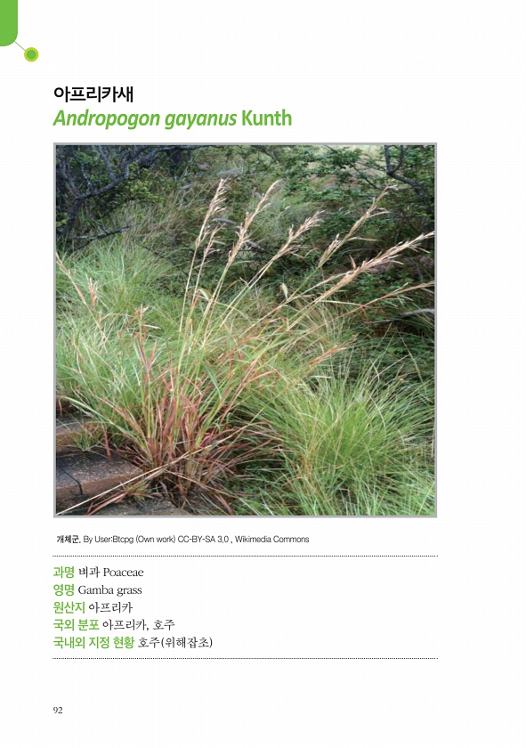 92 아프리카새 Andropogon gayanus Kunth 과명 벼과 Poaceae 영명 Gamba grass 원산지 아프리카 국외 분포 아프리카, 호주 국내외 지정 현황 호주 위해잡초 개체군. By UserBtcpg Own work CC-BY-SA 3.0 , WikimediaCommons