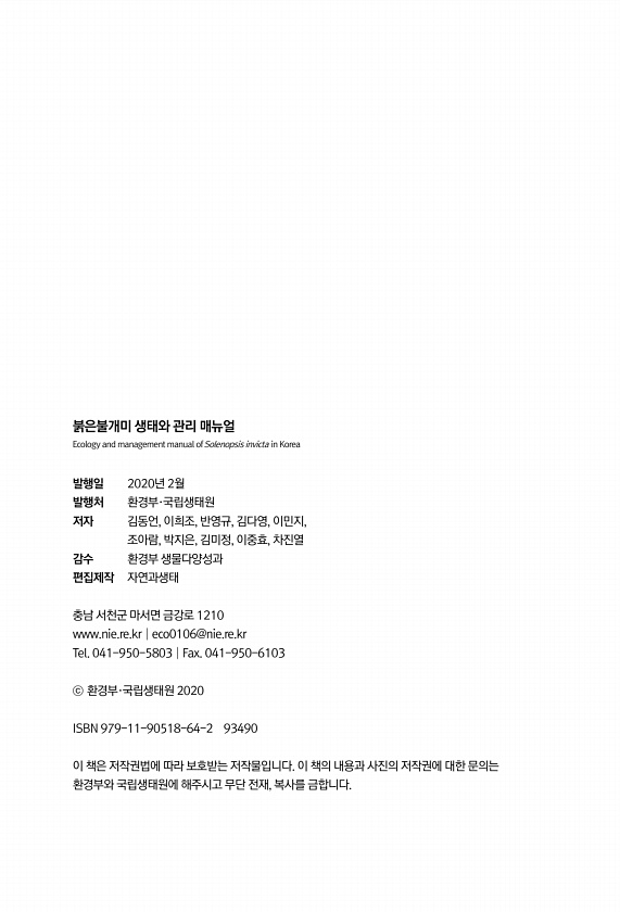 붉은불개미 생태와 관리 매뉴얼 Ecology and management manual ofSolenopsis invicta in Korea 발행일 2020년 2월 발행처 환경부·국립생태원 저자 김동언, 이희조, 반영규, 김다영, 이민지, 조아람, 박지은, 김미정, 이중효, 차진열 감수 환경부 생물다양성과 편집제작 자연과생태 충남 서천군 마서면 금강로 1210 www.nie.re.kr│eco0106@nie.re.kr Tel. 041-950-5803│Fax. 041-950-6103 ⓒ 환경부·국립생태원 2020 ISBN 979-11-90518-64-2 93490 이 책은 저작권법에 따라 보호받는 저작물입니다. 이 책의 내용과 사진의 저작권에 대한 문의는 환경부와 국립생태원에 해주시고 무단 전재, 복사를금합니다.
