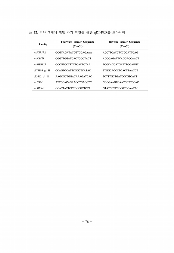 76 표 12. 취약 생태계 진단 마커 확인을 위한 qRT-PCR용 프라이머 Contig Foerward Primer Sequence 5`→3` Reverse Primer Sequence 5`→3` AkHSP17.6 GCGCAGATACGTTCGAGAAA ACCTTCACCTCCGGATTCAG AkNAC29 CGGTTGGATGACTGGGTACT AGGCAGATTCAGGAGCAACT AkMYB123 GGCGTCCCTTCTGACTCTAA TGGCACCATGATTTGGAGGT c173884_g1_i1 CCAGTGCATTCGGCTCATAC TTGGCAGCCTGACTTAACCT c93462_g1_i1 AAGCGCTGGACAAAGATCAC TCTTTGCTGATCCCGTCACT AkCAM3 ATCCCACAGAAGCTGAGG...