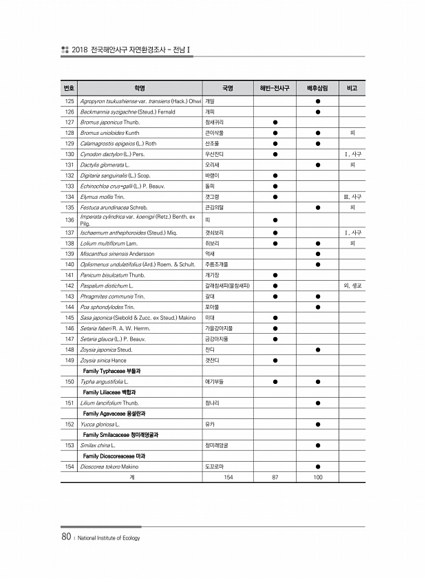 2018 전국해안사구 자연환경조사 전남Ⅰ 80 ? National Institute of Ecology 번호 학명 국명 해빈-전사구 배후삼림 비고 125 Agropyron tsukushiense var. transiens Hack. Ohwi 개밀 ● 126 Beckmannia syzigachne Steud. Fernald 개피 ● 127 Bromus japonicus Thunb. 참새귀리 ● 128 Bromus unioloides Kunth 큰이삭풀 ● ● 외 129 Calamagrostis epigeios L. Roth 산조풀 ● ● 130 Cynodon dactylon L. Pers. 우산잔디 ● Ⅰ, 사구 131 Dactylis glomerata L. 오리새 ● 외 132 Digitaria sangui...