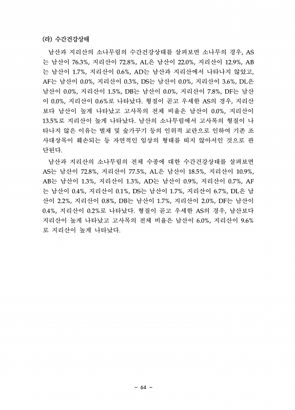 64 라 수간건강상태 남산과 지리산의 소나무림의 수간건강상태를 살펴보면 소나무의 경우, AS 는 남산이 76.3%, 지리산이 72.8%, AL은 남산이 22.0%, 지리산이 12.9%, AB 는 남산이 1.7%, 지리산이 0.6%, AD는 남산과 지리산에서 나타나지 않았고, AF는 남산이 0.0%, 지리산이 0.3%, DS는 남산이 0.0%, 지리산이 3.6%, DL은 남산이 0.0%, 지리산이 1.5%, DB는 남산이 0.0%, 지리산이 7.8%, DF는 남산 이 0.0%, 지리산이 0.6%로 나타났다. 형질이 곧고 우세한 AS의 경우, 지리산 보다 남산이 높게 나타났고 고사목의 전체 비율은 남산이 0.0%, 지리산이 13.5%로 지리산이 높게 나타났다. 남산의 소나무림에서 고사목의 형질이 나 타나지 않은...