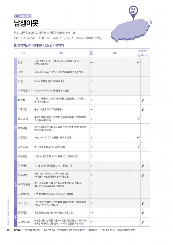 No. 제주- 제주 040 본 생태자산의 생태계서비스 간이평가지 구분 예시 평가 등급 설명 규모별 혜택 지점 지역 국가 공급 담수 식수, 농업용수, 축산 용수 등 물을 저장하여 식수 및 농업용수를 제공 ++ √ 식량 곡물, 과실, 물고기 등 인간 및 야생동물에게 먹거리 제공 0 자원 목재나 약재 등 상품의 재료로 활용 0 친환경에너지 태양열이나 풍력, 조력을 통해 전기 생산 0 조절 대기질 자동차 배기가스, 산업체 대기오염, 농업발생 먼지, 미세먼지 등 대기오염 감소 + √ 기후조절 온실가스를 줄이고 기후변화 완화 + √ 홍수 재해 홍수로 인한 범람에 대한 조절, 집중강우에 대한 조절 폭우로 인한 홍수피해 저감 + √ 토양유실 토양 소실을 방어하는 밀도 높은 식생의 존재, 비와 바람으로 인한 토양유실 완화,...
