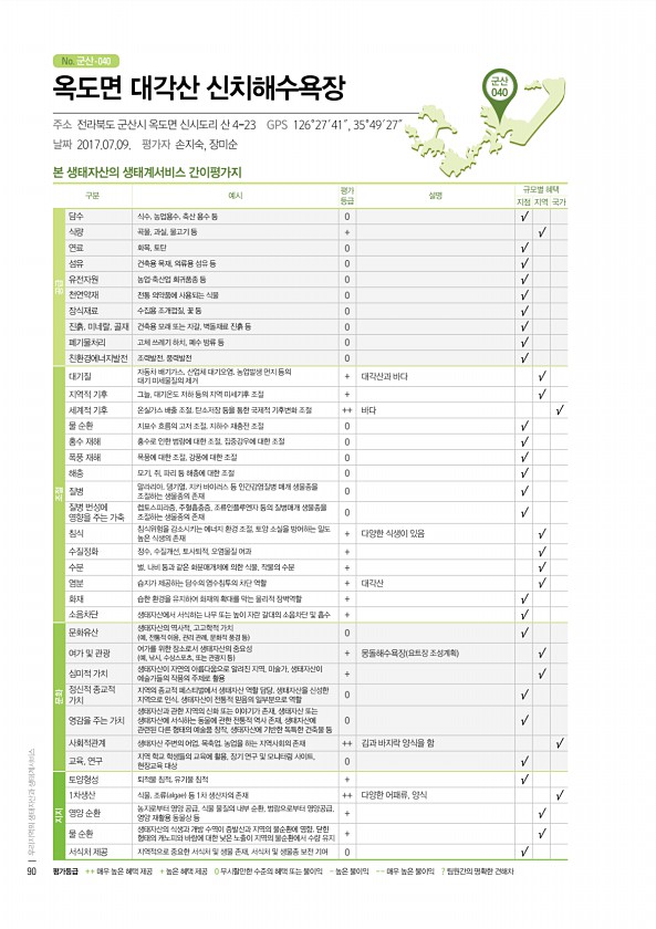 No. 군산- 군산 040 본 생태자산의 생태계서비스 간이평가지 구분 예시 평가 등급 설명 규모별 혜택 지점 지역 국가 공급 담수 식수, 농업용수, 축산 용수 등 0 √ 식량 곡물, 과실, 물고기 등 + √ 연료 화목, 토탄 0 √ 섬유 건축용 목재, 의류용 섬유 등 0 √ 유전자원 농업·축산업 희귀품종 등 0 √ 천연약재 전통 의약품에 사용되는 식물 0 √ 장식재료 수집용 조개껍질, 꽃 등 0 √ 진흙, 미네랄, 골재 건축용 모래 또는 자갈, 벽돌재료 진흙 등 0 √ 폐기물처리 고체 쓰레기 하치, 폐수 방류 등 0 √ 친환경에너지발전 조력발전, 풍력발전 0 √ 조절 대기질 자동차 배기가스, 산업체 대기오염, 농업발생 먼지 등의 대기 미세물질의 제거 + 대각산과 바다 √ 지역적 기후 그늘, 대기온도 저하 등...
