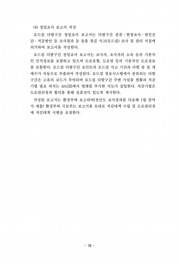 78 4 정밀조사 보고서 작성 로드킬 다발구간 정밀조사 보고서는 다발구간 분류·현장조사·원인진 단·저감방안 등 조사결과 등 동물 찻길 사고 로드킬 조사 및 관리 지침에 의거하여 보고서를 작성한다. 로드킬 다발구간 정밀조사 보고서는 조사자, 조사자의 소속 등의 기본적 인 인적정보를 포함하고 있으며 도로유형, 도로명 등의 기본적인 도로정보 를 포함한다. 로드킬 다발구간 포인트의 로드킬 사고 기간과 다발 종 및 개 체수가 자동으로 추출되어 작성된다. 로드킬 정보시스템에서 분류되는 다발 구간은 고유의 코드가 부여되며 로드킬 다발구간 주변 시설물 현황과 저감 기법 필요 위치는 ArcGIS에서 범례를 추가한 지도가 삽입한다. 저감기법은 도로관리청과 협의를 통해 실효성이 있도록 제시한다. 작성된 보고서는 환경부에 보고되...