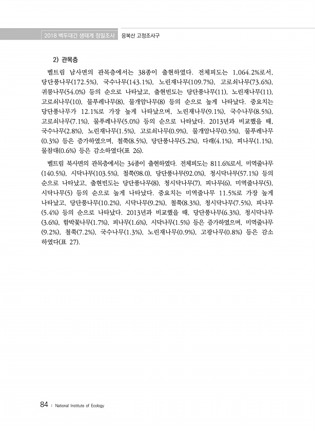 2018 백두대간 생태계 정밀조사 응복산 고정조사구 84 ? National Institute of Ecology 2 관목층 벨트림 남사면의 관목층에서는 38종이 출현하였다. 전체피도는 1,064.2%로서, 당단풍나무 172.5% , 국수나무 143.1% , 노린재나무 109.7% , 고로쇠나무 73.6% , 귀룽나무 54.0% 등의 순으로 나타났고, 출현빈도는 당단풍나무 11 , 노린재나무 11 , 고로쇠나무 10 , 물푸레나무 8 , 물개암나무 8 등의 순으로 높게 나타났다. 중요치는 당단풍나무가 12.1%로 가장 높게 나타났으며, 노린재나무 9.1% , 국수나무 8.5% , 고로쇠나무 7.1% , 물푸레나무 5.0% 등의 순으로 나타났다. 2013년과 비교했을 때, 국수나무 2.8% , 노린재나무 1....